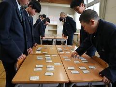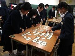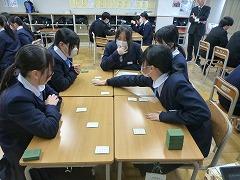 午後は「かるた大会」です。各クラスが12チームに分かれ、全グループの取り札の枚数で競います。11名の職員が交代しながら札を詠みました。教室からは、1枚取るたびに歓声が上がり、その声も終盤になるほど大きくなっていきました。各学年の優勝クラスは、1年1組、2年2組、3年2組 でした。