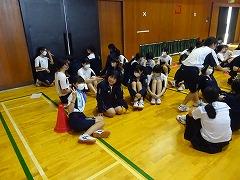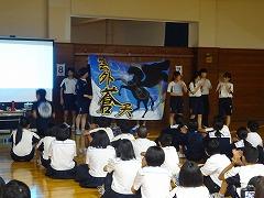 6限は赤団、青団に分かれて練習(写真下段)を行いました。3年生が1、2年生にパフォーマンス(応援合戦)での応援隊形や応援歌について説明していました。しっかり伝えるために、3年生は応援隊形の図や、応援歌の書かれたプリントを用意していました。さすがです。