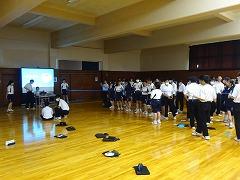 朝からの雨と午前中は降雨との予報もあったことで、文字通り水を差された格好になりましたが、グラウンドから体育館に場所を移して、運動会予行演習を行いました。体育館で開会式、閉会式、各競技の招集隊形の確認をしました。また,予行演習後は、赤団。青団に分かれてブロック練習を行いました。ぜひ、本番で生徒たちの活躍するようすを、ご覧いただきたいので、今日は詳しく掲載しません。