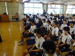 6月の全校集会が行われました。集会に先立ち、行われた表彰披露では、郡市中学校春季大会で団体優勝したソフトテニス部、郡市陸上競技大会で県体出場を勝ち取った陸上部、学校外のトランポリン競技で優秀な成績を収めた皆さんがステージに上がりました。