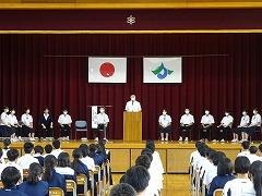 さらに、後期生徒会・学級役員任命式も行われました。校長先生より「信任した全校生徒の思いを汲み取り、汗を流してほしい」と激励の言葉がかけられました。その後の生徒会のコーナーでは、ステージ上で前期役員と後期役員のバトンタッチが行われ、任命を受けた後期生徒会役員より早速、11月2日(木)に開催する文化祭テーマ「最高潮~クライマックス~」が発表されました。全校生徒の皆さんも生徒会役員、学級代表を支え、後期の活動でも高松中学校の団結力とパワーを発揮してください。