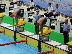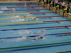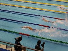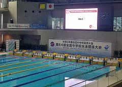 森田 晴也 さん(3の1)が、金沢市で開催された、全国中学校水泳競技大会に出場しました。森田さんが出場する100m 自由形では、全国から40名の精鋭が集い覇を競いました。写真で、一番手前のレーンを泳いでいるのが森田さんです。全国大会で、見事「自己ベスト」を更新したものの、惜しくも決勝(上位8名)には進めませんでしたが、地元開催での大きな声援を受ける中、堂々の泳ぎを披露しました。これまでの努力が実り「目標にしていた舞台」に立つことにつながりました。また、森田さんの頑張りから、たくさんの元気をもらいました。お疲れさまでした。