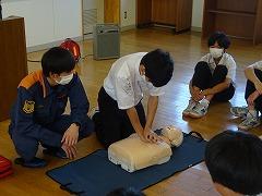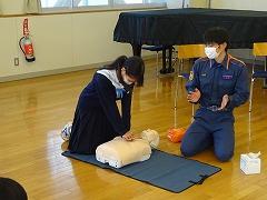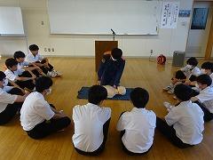 2年生全員を対象に、講師にかほく市消防本部の方をお招きして、救命講習会が行われました 。今日までに、2年生は保健体育科の授業で胸部圧迫、AEDの使用、人工呼吸等の心肺蘇生法に映像等で学習をしました。今日は、実際に人形を使って、胸骨圧迫をしたりしましたが、真剣な顔つきで一生懸命に実習をしていました。講師の方からは、救命が必要な時、その場に居合わせた人の処置によって命を救うことが多くあるそうです。そのような場面に出会うことがあった場合は、消防や近くの大人に伝えることも大切ですが、1歩を踏み出して救助にあたってほしいと話がありました。