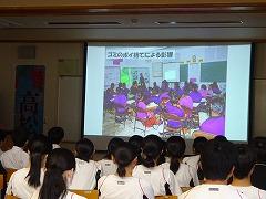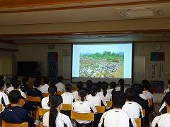 西村氏は2年間の海外協力隊での仕事で、ダンプサイト(ゴミの集積場)に集まる家庭ゴミの半分が非分解性であることを調べました。続いて、アルミ缶のディポジット制度やODA(政府開発援助)を活用し、現地のリサイクルセンターを改修すると同時にアルミ缶のゴミを回収することにつなげました。また、悪意なくゴミを投げ捨てることが日常になっている姿に疑問を持ち、ポイ捨てによる弊害について小学校で啓発活動を行ったことなどを多くの写真や動画を交えて中学生に分かりやすくお話ししてくださいました。西村氏の活動は、今も現地に根づいているとのことでした。