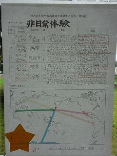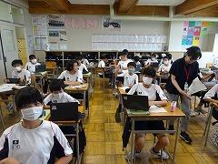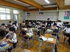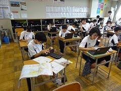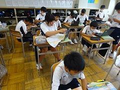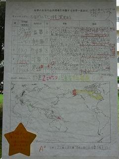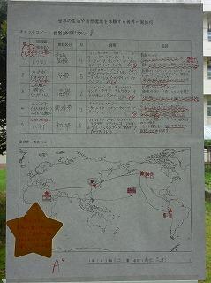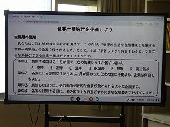 1年生教室横廊下に社会科の授業で取り組んだ「世界一周旅行を企画しよう」の優秀作品が掲示されています。生徒fが架空の旅行会社の社員という設定で、訪問する国の気候帯が異なること、滞在期間は1ヶ月、伝統料理を食べることを企画するなど、いくつかの条件が定められています。写真は1年2組が旅行プランを作成している授業のようすです。自分だけのプランを作り出そうと頑張っていました。掲示された作品はすべて、丁寧に調べた跡が伺えます。1学期のまとめにふさわしい素敵な作品でした。