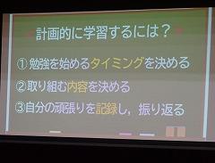続いて、学習担当、生活担当の先生より話がありました。5月の学習目標は「テストに向け計画的に学習しよう」、生活目標は「みんなが楽しい学校」です。学習については「計画的に学習するための3つのコツ」を、生活については「嫌なこと、困ったことがあったら気軽に先生型に相談してほしい」と話がありました。