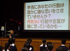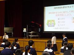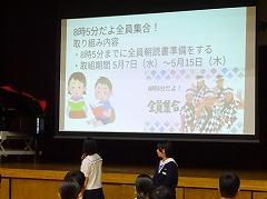 生徒会執行部からは5月の取組「Unicef 募金」について、重点委員会の生活委員会からは「授業終始のあいさつの取組」を、各学年プログラム委員会からも今月の取組が話されました。5月中旬には修学旅行をはじめ、各学年で校外学習が計画されています。ルールの中で、学習できたり、楽しい思い出が作られたりできるように、皆さんの活動の成功を願っています。