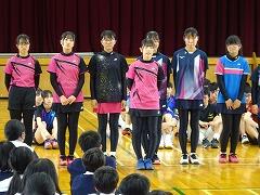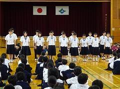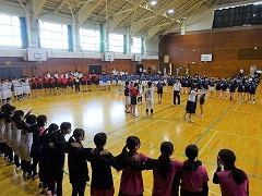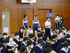 明後日のバドミントン競技からスタートする加賀地区大会、県陸上競技大会、中部日本吹奏楽コンクール県大会の壮行会が行われました。吹奏楽部の演奏、生徒の拍手の中、大会に出場する生徒が入場しました。壮行会では、各部活動顧問より選手の紹介があり、各部長が大会に臨む意気込みを話しました。校歌や手拍子による応援の後、吹奏楽部部長の 沖野 さくら(3の1)さん が「これまでの練習の成果を発揮します」と力強く宣誓を行いました。壮行会の最後は、選手全員が円陣を組み、それぞれの健闘を祈って大きな拍手を送りました。