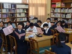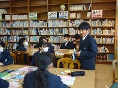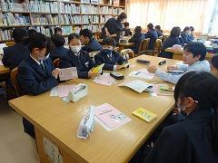 昨日までに、全学級が学校図書館に入り、読書の効果や図書館の利用等について、澤野学校司書よりお話しがありました。特に1年生は図書館の使い方を知ること、図書の分類を知ること、図書の貸出、返却の手順を知り実際に本を借りることを目的としています。短い時間でしたが、1年生は各分類から本を選びグループ、学級内で本の紹介をし「ミニ・ビブリオバトル」のようでした。