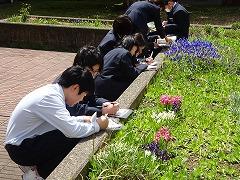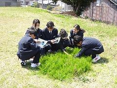 4限、1年2組「理科の授業」のようすです。中庭や校舎横の空き地に出て、植物のスケッチをしていました。スケッチをしながら教科書や理科便覧を使用して植物の名前を探していました。よく見てみると群生している草の中に、小さな花が咲いているのを見つけることができました。今日は天気も良く、外の空気が気持ち良かったです。