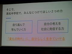 そこで、高松中学校では「高中スタイル」という「自分で学び方を考えて、学習を進めるスタイル」の授業を進めます。「高中スタイル」の授業とは本校生徒に ① 自ら進んで学んでいく力、② 自分の考えを社会に発信する力 の2つを身につけることをめざして実施する授業です。