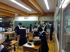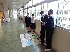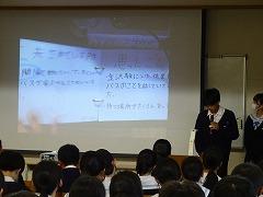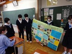 9日(木)に行われた「金沢班別自主プラン」の発表会が行われました。写真上段は、発表会前の最後の練習のようす、中段は、2年生全員の前で行った発表会のようす、下段は、2年生の廊下に掲示してある写真です。