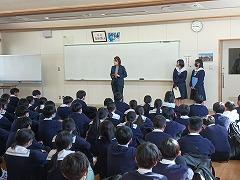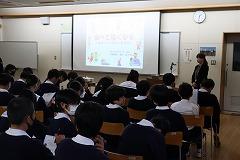 河北台中学校 細山栄養教諭 を講師にお迎えして食育講座が行われました。(写真上)2年生は「体力づくりに役立つ食生活」をテーマにお話しをいただきました。 細山先生から、「健康な生活を送るために『食事・運動・休養』が必要で、自分で自分の体をつくり、自分の人生をつくっていくことを考えてほしい」と話がありました。これからも、かほく市のおいしい給食をしっかり食べましょう。