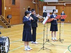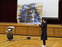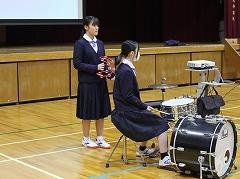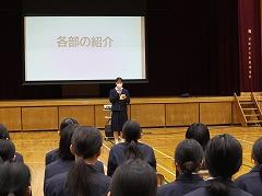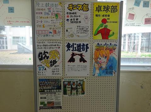 業後に1年生を対象に「部活動紹介式」が行われました。各部の代表が、1年生を前に普段の活動内容を説明しました。中でも、卓球部はラリーの実演、吹奏楽部は楽器紹介や合奏、創作部は文化祭で作成したトリックアートの披露など、工夫を凝らしていました。1年生教室横の廊下には部員募集のポスターが掲示されています。また、かほく市地域スポーツクラブ「パレット」の方にもお越しいただき、パレット主催の活動についても教えていただきました。
