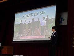 6限に生徒総会が行われました。今日の生徒総会では、生徒会目標と各学級からの発表がありました。今年度の生徒会目標は「STAND BY ME」です。この目標には「一人一人がみんなに寄り添って、みんなが主人公になれるように」という思いが込められています。続いてのクラス紹介では「学級目標とその目標に込められた思い」「学級のようす」「担任・副担任の紹介」などが盛り込まれていました。特に3年3組の発表では、学級目標の「ONE FOR ALL」にちなんで、毎日の帰りホームで「今日のONE FOR ALL」という互いの素敵な実践を発表する取組を行っているそうです。また、発表の最後に声を出し、意気込みを表現するパフォーマンスする学級など、どの学級もしっかり準備をして、この生徒総会に臨んでいました。