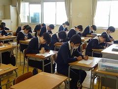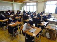今日は朝学習・朝読書の時間に漢字テストを行いました。昨年度までの英語、国語の2教科から今年度は、国語、社会、数学、理科、英語の5教科で10分程度の小テストを実施します。テスト期間や学校行事を考慮し、生徒の負担のない時期に学期に各教科1回程度実施します。また、テストの内容は事前に伝え、全員が満点を目標にできる出題とし、テストの実施日は木曜日としています。木曜日に行うのは、部活動休養日の水曜日に学習時間を確保することが理由です。今日は、どの学年もしっかりテストに向き合っていました。(写真は左から1、2、3年の順)