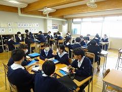 2年生、FTの時間のようすです。FTとは「総合的な学習の時間」のことで、「F」:Future、ふるさと 「T」:Time から頭文字をとって名付けられています。今日のテーマは2つ、1つ目は「2年生としての過ごし方」です。1年間の中学校生活を経験し、「言われなくてもできる」自律した行動をとれることが目標です。担当の先生からは「if then ルール」(こういうときに、こうします)が紹介されました。そのルールを決定することで目標達成率が40%上昇するとのことでした。「スマホを触るときは学習アプリから触る」「家に帰ったらすぐ、カバンを開いて学習道具を並べる」など、それぞれのルールを考えて、発表しました。
