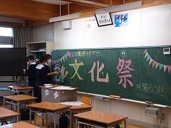 渡り廊下には、各学年のFT(総合的な学習の時間)の展示が張り出されました。放課後は3年生のステージ画制作班が追い込みに入っていました。創作部は体育館の飾り付け、パフォーマンス出演者は教室で練習とそれぞれの場所で精力的に活動していました。このように、学校は文化祭目前!!明後日を楽しみにしています。