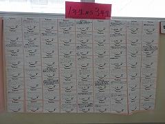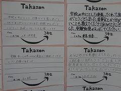 今日の全校集会で紹介された生徒会執行部「Takazon」の取組です。受験や部活動のことなど、同学年も含めた各学年に、受験や部活動等の応援メッセージを送ります。高松中とメッセージを送ることから、大手物流会社の社名とかけたものです。下の写真は3年生教室横の廊下に張り出された3学年からのメッセージです。