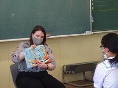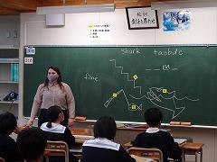 本校にはALTのローラ先生がいます。写真(左・中)は1年3組の授業のようすです。教科書に出ている単語を推測するゲームに、とても盛り上がっていました。決められた回数の中で、その単語が導き出せなければ、サメに食べられてしまうと言う設定で緊張感も生まれていました。また、毎週、木曜日の昼休みに、英語の絵本の読み聞かせ(写真右)をしています。ローラ先生の授業などを通して、英語をもっと好きになってくれたらうれしいです。
