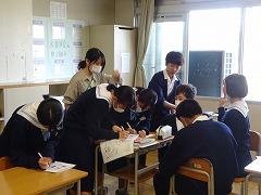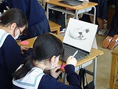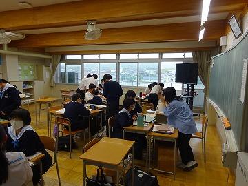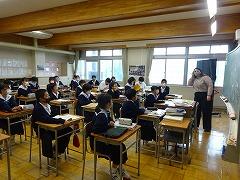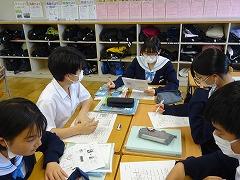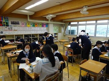 今日は5限、3年2組社会、1年2組美術の授業のようすを紹介します。社会の授業では、「なぜ、国力差のあるアメリカと戦争を始めたのか」という課題について、資料を読み取った感想を班で話し合い、政治、経済などの視点から日本が開戦した理由に迫っていました。自分の考えを話したい、聞いてほしいと言う雰囲気がありました。