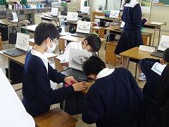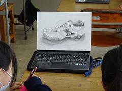 美術の授業は、シューズデッサンが完成し、これまでの学習の振り返りと作品の発表会をしました。教科名が図画工作から美術に変わり、これまでの授業では、空間の捉え方や、自ら鉛筆を削って明暗やグラデーションを表現するなど、専門的な学びがありました。それぞれが工夫して仕上げたデッサンなので、友達の苦労も分かるためか、良い点をたくさん書いて伝えていました。