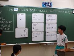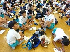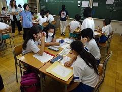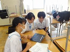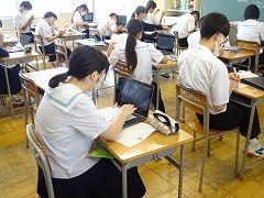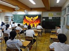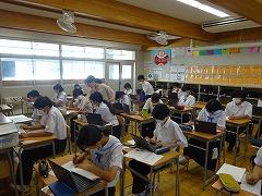 登校日の日程を終えた3年2組教室では、運動会応援リーダーがパフォーマンスのフォーメーションや応援歌の歌詞づくりに頑張っていました。3年1組はオンラインで応援づくりをしているとのことでした。夏休み終盤も3年生は、学校の顔として「運動会」の成功のために汗をかいています。