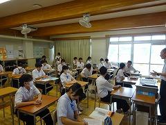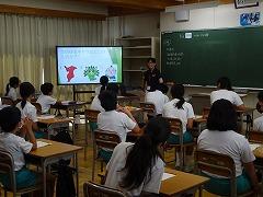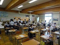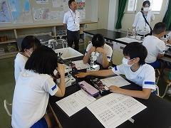 来年、本校に入学する大海小学校、髙松小学校6年生の皆さんが「授業体験」と「部活動見学」に訪れてくれました。この取組は中学校の雰囲気を知ることで、中学校入学への不安が少しでも軽くすることがねらいです。最初は数学、社会、理科の3つのグループに分かれて「授業体験」をしました。社会科の授業では、3種類の ゆるキャラ がどの県のものなのか資料から推測しました。数学の授業では、正多面体を模型でつくり、その特徴を調べました。理科の授業では、実態双眼顕微鏡を使って観察をしました。少し難しい内容もあったかも知れませんが、しっかり話を聞いて、取り組んでくれました。グループの活動では、2小学校の児童が協力して取り組む場面も見られ、頼もしく感じました。授業体験の後は「部活動見学」です。3グループに分かれ、本校のすべての部活動の様子を見学しました。中学生も6年生の頃を思い出したのか、手を振ったり、笑顔で迎えていました。