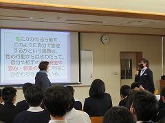 2年生を対象に、星の子助産院の 坂谷 理恵子 氏を講師にお迎えし「思春期講座」が開かれました。前半(5限)の講義の中では、「生」と「性」をつなげて考えてほしい。心のついた「性」は生き方に表れるので大切にしてほしいと話をされ、心の部分はもちろん、性についてのマナーやエチケット、科学的理解を深めました。後半(6限)では、妊婦体験、人形を使って赤ちゃんを抱っこする体験、出産の疑似体験もありました。身体も成長し、心も揺れ動くからこそ「思春期」です。誰もが通る道です。決して自分だけではと思わないでください。