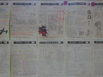 ゴールデンウィークに続き、夏休みも国語科の課題として取り組んだ「本との出会い」が玄関ホール、図書室横に掲示されています。をまとめました。全校生徒が1冊、みんなに読んでもらいたい本を紹介する取組です。選んだ本について、書名、著者名のほか、「あらすじ」「登場人物」「読後の感想」など、その本の魅力が1枚にまとめられていて、思わず読んでみたくなります。気になる本があった人は、ぜひ、図書館へ足を運びましょう。