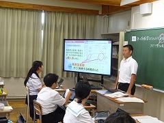 「体の各器官の発育・発達の仕方はどのようなものか」という課題について、発育と発達の意味の違いを確認した後、いろいろな器官の発育の特徴について、用意された資料や、タブレットで検索して調べました。調べたところ、脳の発育は早いことや急激に発育する発育急進期があることを知りました。それぞれが調べたことをモニタ上で共有し、今日の課題についてまとめていました。