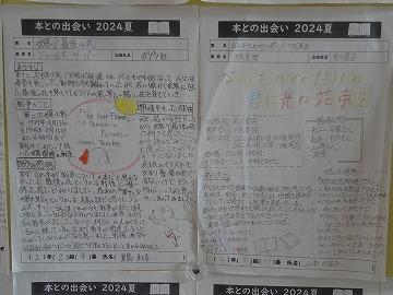 ゴールデンウィークに続き、夏休みも国語科の課題として取り組んだ「本との出会い」が玄関ホール、図書室横に掲示されています。をまとめました。全校生徒が1冊、みんなに読んでもらいたい本を紹介する取組です。選んだ本について、書名、著者名のほか、「あらすじ」「登場人物」「読後の感想」など、その本の魅力が1枚にまとめられていて、思わず読んでみたくなります。気になる本があった人は、ぜひ、図書館へ足を運びましょう。