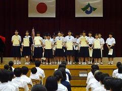 1学期最後の月になりました。今日は7月の全校集会が行われました。集会に先立ち、ホームページにもお知らせした加賀地区大会、中部日本吹奏楽コンクール県大会等で、優秀な成績を収めた部活動等の表彰披露が行われました。