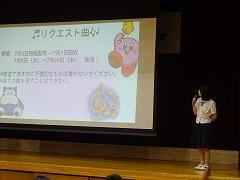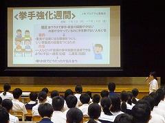 続いての集会で校長先生から、3年生は、進路選択に向けての切り替えが必要な7月、2年生は、明日からの職場体験に臨む7月、1年生は、FTのプロジェクトにおいて自分の進路、生き方を学んでいることなど、それぞれの学年で進路について考える活動の多い7月のテーマを「進路は今と夢をつなぐ路」とし、話がありました。