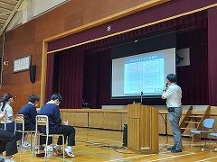 午後より、3年生を対象に「高校説明会」が行われました。県内の公立高校(普通科、実業科)、高等専門学校、私立高校より6校の先生方をお招きし、それぞれの学校の特色(進学・就職状況、学校行事、部活動など)、求めている生徒像について、お話をいただきました。さらに高校の先生方からは、3年生に向けて「希望する学科への希望を強く持つことや、将来の夢への強い信念を持つことが学びの原動力になること」「毎日の学校生活(あいさつ、マナー、学基礎となる学習、体力を身に付ける)をしっかりと過ごしてほしい」と進路選択に向けて、今すべきこともお話してくださいました。説明会後は教室に戻り、聞き取ったメモや高校のパンフレット等を見ながら振り返りを行いました。