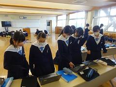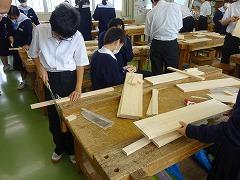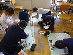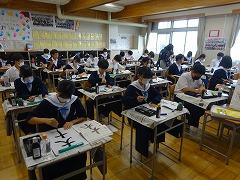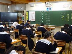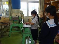 2年生のようすを取材しているときに、1年生も、授業を頑張っている姿が見られたので掲載します。1組は「数学」の授業です。「全員発言モリモリ大作戦」の取組の成果でしょうか。全員が挙手しています。さすがです。2組は「技術」の授業です。両刃のこぎりやベルトサンダーなどの工具、機械を使用して製作しています。3組は「毛筆」の授業です。お手本を見ながら丁寧に筆を運んでいます。まるで、息を呑んでいるかのように集中していました。