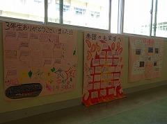 運動会を終えて、1、2年生から3年生へ、3年生から1、2年生へ思いを伝えるメッセージが、3年生教室横の廊下に掲示されています。1年生からは「ブロック練習から引っ張ってくれてありがとうございました。いつでも全力で取り組んでいる姿がとてもすごいなと思っていました」、2年生からは「来年の運動会では、今の3年生を良きお手本にして、頑張っていきたいと思いました」など、感謝の言葉が伝えられています。写真下段は青団(3年1組)の生徒がメッセージを作成し、今日の給食時に、そのメッセージを届けている様子です。運動会で学んだ「思いやり、協力」、3年生は「リーダーシップ・責任」を、その時だけで終わらせずに続けてください。
