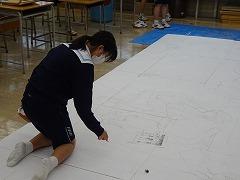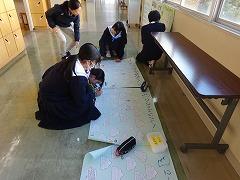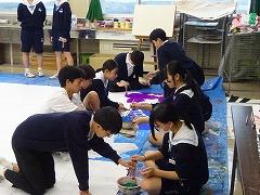 今日は3年生のFT(総合的な学習の時間)、文化祭準備のようすを掲載します。3年生は、2学期から「SDGs」について学習を進めてきました。SDGsの17の目標を「経済」「社会」「環境・自然」のまとまりに分け、それぞれステージ劇、展示の形で発表します。ステージ劇の小道具でしょうか、アンパンマンのキャラクターや、浦島太郎の腰巻を作成しているグループもありました。どのようにSDGsにつながるのか文化祭当日が、ただただ楽しみです。また、3年生はステージ壁画も担当しています。縦5m、横7mほどの大きさの壁画です。今日から着色に入ったようです。こちらも出来上がりが、ただただ楽しみです。