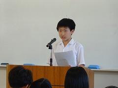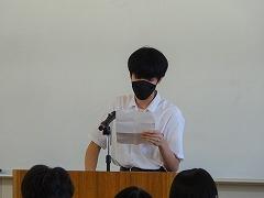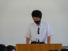 5限に、2年生の意見発表会(学年予選会)が開かれ、進行は図書委員会が行いました。各クラスの予選を通過した6名が2年生全員の前で、自分の主張を発表しました。なお、審査は内容、論旨、論調の3項目で行われました。6人が発表した内容は、ニュース等で見られるDV、性的マイノリティについて調べたことや、調べることで感じた自分の思い、先人の生き方から学んだ最後まで頑張ることの大切さ、動物の飼い主の責任から命の大切さ、いじめ、意識で環境を変えることなど、主題は様々でした。今日は学年審査でしたが、全校生徒が意見文に取り組んでいます。友達の意見を聞き、自分の思いと比較したり、思いが広がったりしたことと思います。