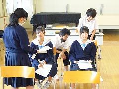 2年生も文化祭に向け、FT(総合的な学習の時間)は、ステージ発表などの準備をしています。今日は2年生のようすを掲載します。2年生は、夏休みに実施した「職場体験」で学んだことを「働くっていいな」というテーマ、でステージ劇、掲示、替え歌の3グループに分かれて準備を進めていました。この日、ステージ劇グループは、脚本を見ずに通し稽古をしていました。本番では、照明や衣装も加わり、より見栄えのするものになると思います。もっと、内容を伝えたいのですが、1年生と同様に、文化祭の発表まで楽しみにとっておこうと思います。