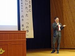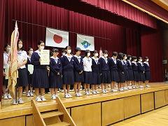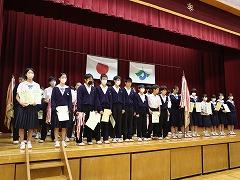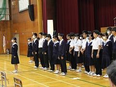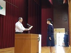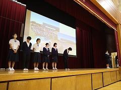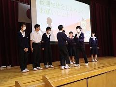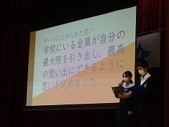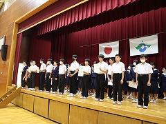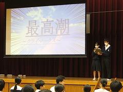 さらに、後期生徒会・学級役員任命式も行われました。校長先生より「信任した全校生徒の思いを汲み取り、汗を流してほしい」と激励の言葉がかけられました。その後の生徒会のコーナーでは、ステージ上で前期役員と後期役員のバトンタッチが行われ、任命を受けた後期生徒会役員より早速、11月2日(木)に開催する文化祭テーマ「最高潮~クライマックス~」が発表されました。全校生徒の皆さんも生徒会役員、学級代表を支え、後期の活動でも高松中学校の団結力とパワーを発揮してください。