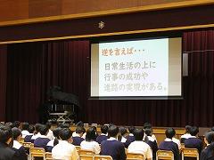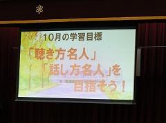今日は10月の全校集会から1日がスタートしました。最初は表彰披露です。この欄でも紹介したように9月中に行われた新人大会で優秀な成績を収めた生徒が披露されました。多くの生徒がステージに登壇し、新人大会での活躍を改めて感じることとなりました。続いて、校長先生が2学期のテーマ「挑戦」し、生徒一人一人の挑戦が積み重なって成功を収めた新人大会、運動会の様子がスライドショーとして映されました。また、9月の成功で学んだ「協力、思いやり」、3年生は「リーダーシップ、責任」を一時のものとしないためにも、10月のテーマは「行事の成功は『行事後の生活』に現れる」との話がありました。また、10月の生活目標は「きちんとした身なりや言葉遣いを意識しよう 」、学習目標は「『聴き方名人』『話し方名人』を目指そう!」です。それぞれ担当の先生より、意識するポイントについて話がありました。