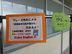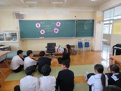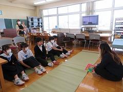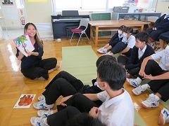 8月より着任され、9月より高松地区の小中学校で英語教育に携わっていただいているグレース先生の「Book Reading(読み聞かせ)」が、昼休みにキャリアルームで行われました。グレース先生の母国、アメリカでは誰かが本を読んでくれる時は、一緒に床に座るそうです。今日は床にシートを敷いてアメリカン・スタイルで開催しました。今日、読まれたのは「Chicka Chicka Boom Boom」、終始楽しいムードでした。今後、この「Book Reading」は、木曜日の昼休みを基本に週1回、開かれる予定です。