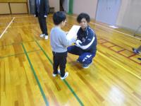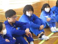 1,2年生が体育館で一緒に縄跳びをしていました。2年生が1年生に一生懸命教えています。