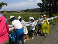 1年生は6年生に手を引かれ、みんな一言もしゃべることなく真剣に避難しました。避難訓練は終了し、ゴミを拾いながら学校まで戻りました。