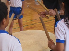 10月13日(火)地域の指導者、室谷美恵子様,洲﨑普美代様,田中佑里恵様が来校され,2回目の太鼓教室が行われました。2回目とあって,今年から参加している1年生もぐんぐんと上達しています。大ばいも、覚えてきました。11月14日(土)に開かれる学習発表会での発表に向けて練習を重ねています。