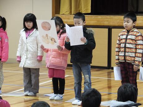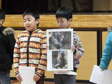 1年生の学年発表がありました。国語の時間で動物の赤ちゃんについて勉強したそうです。ライオンの赤ちゃんと他の動物の赤ちゃんについて、似ているところをみんなに教えてくれました。