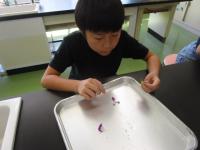 ピンセットで、花びらやがく、おしべやめしべを取り出して、観察しています。