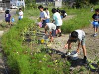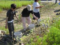 暑い中、水をいっぱいにためたバケツやジョウロをもって、コスモス畑に向かいます。