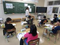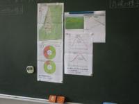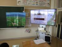 授業の様子です。黒板に貼ってある複数の資料や、大型テレビに映し出された資料など、